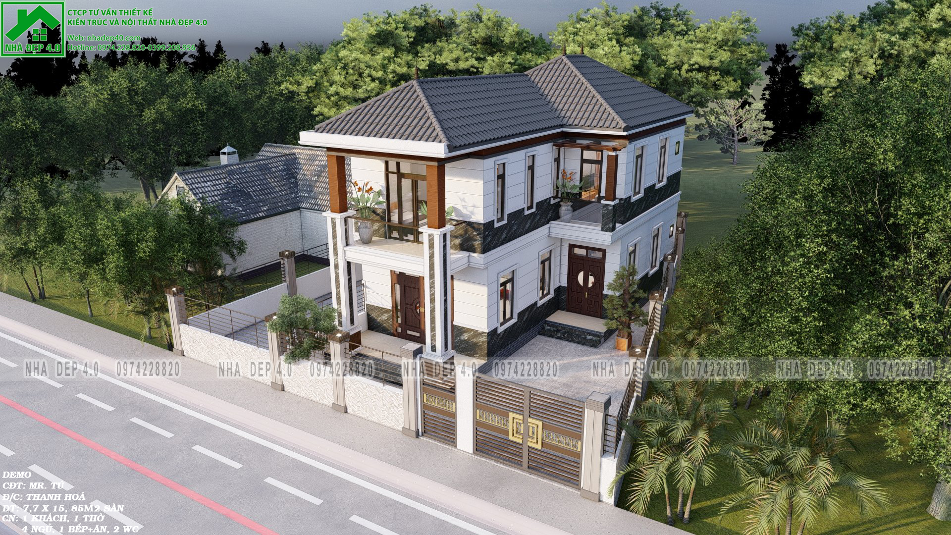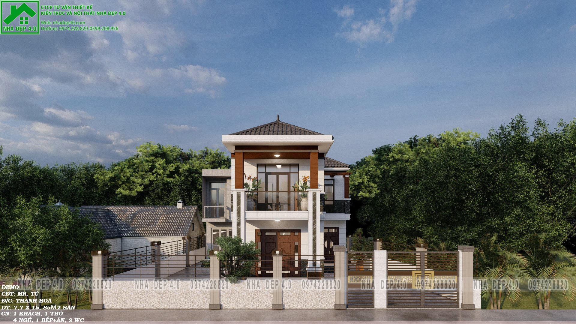 Mẫu nhà 2 tầng mái Nhật của gia đình anh Tú tại Thanh Hoá không quá cầu kỳ, cũng không quá nổi bật. Gia đình anh sở hữu mảnh đất không quá rộng, tuy vậy dưới sự sáng tạo của đội ngũ KTS đến từ công ty thiết kế Nhà Đẹp 4.0 đã đem đến một công trình nhà biệt thự 2 tầng mái Nhật đẹp – sang trọng – nổi bật trong không gian. Nhìn từ bản vẽ phối cảnh ngoại thất nhiều người không tin rằng công trình có chi phí dự kiến khoảng 1.2 tỷ, bởi ngôi nhà mang vẻ đẹp xa hoa bề thế vừa có tính thẩm mỹ cao và công năng sử dụng khoa học, hợp lý.