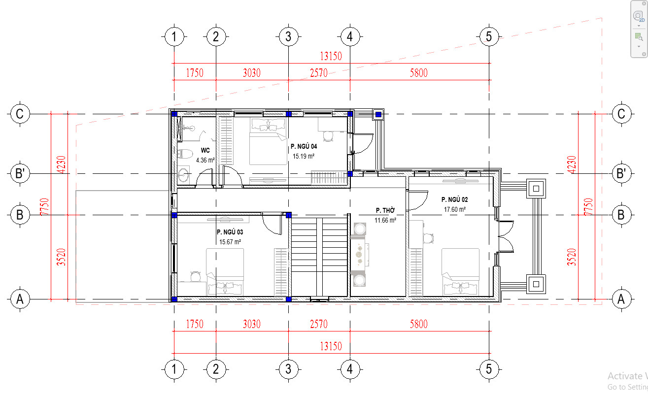 Mặt bằng tầng 2 được thiết kế 3 phòng ngủ nhỏ cùng vơi không gian phòng thờ (11,6m2), có 1 WC chung cho toàn tầng tương tự như ở tầng 1.