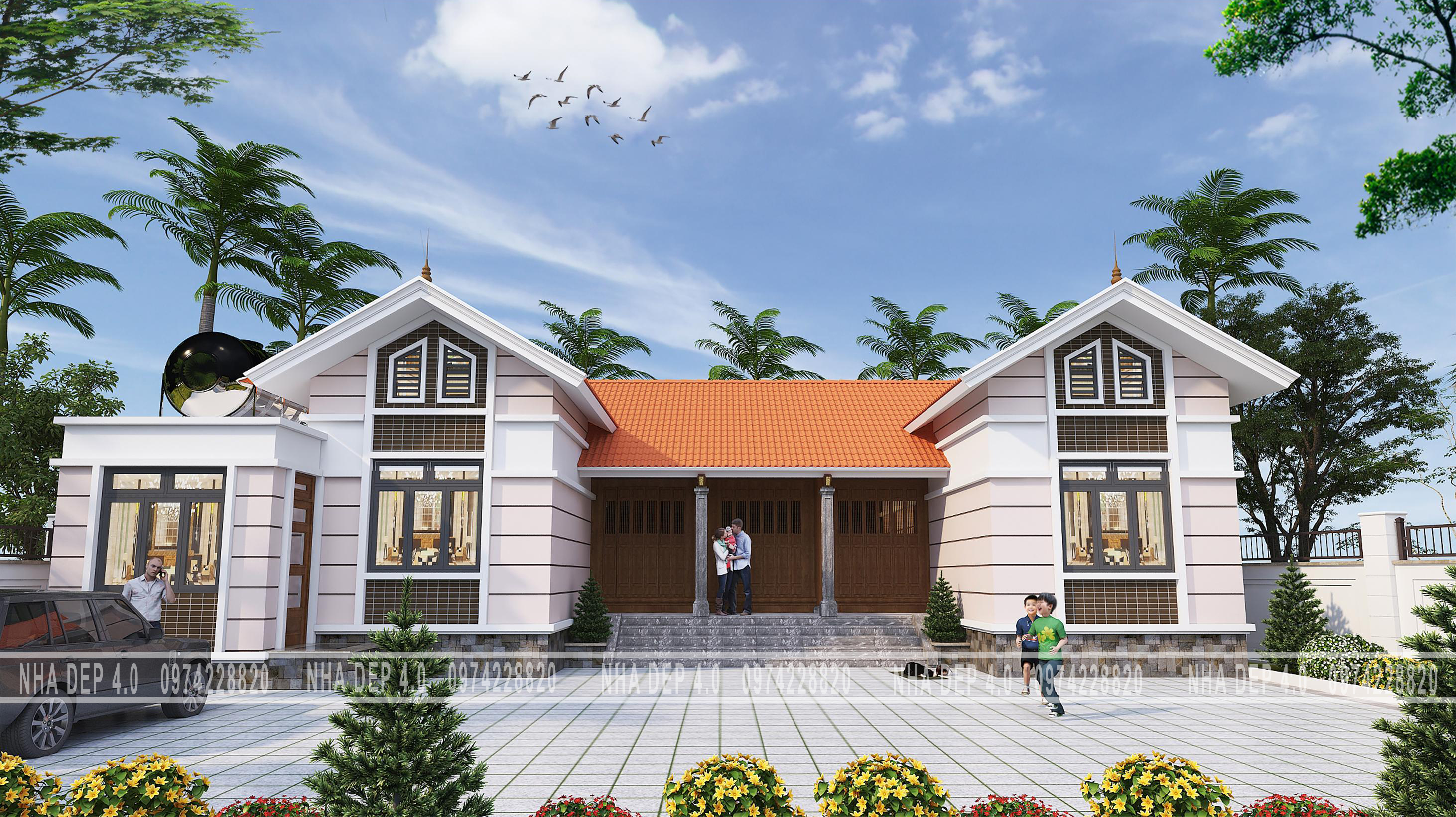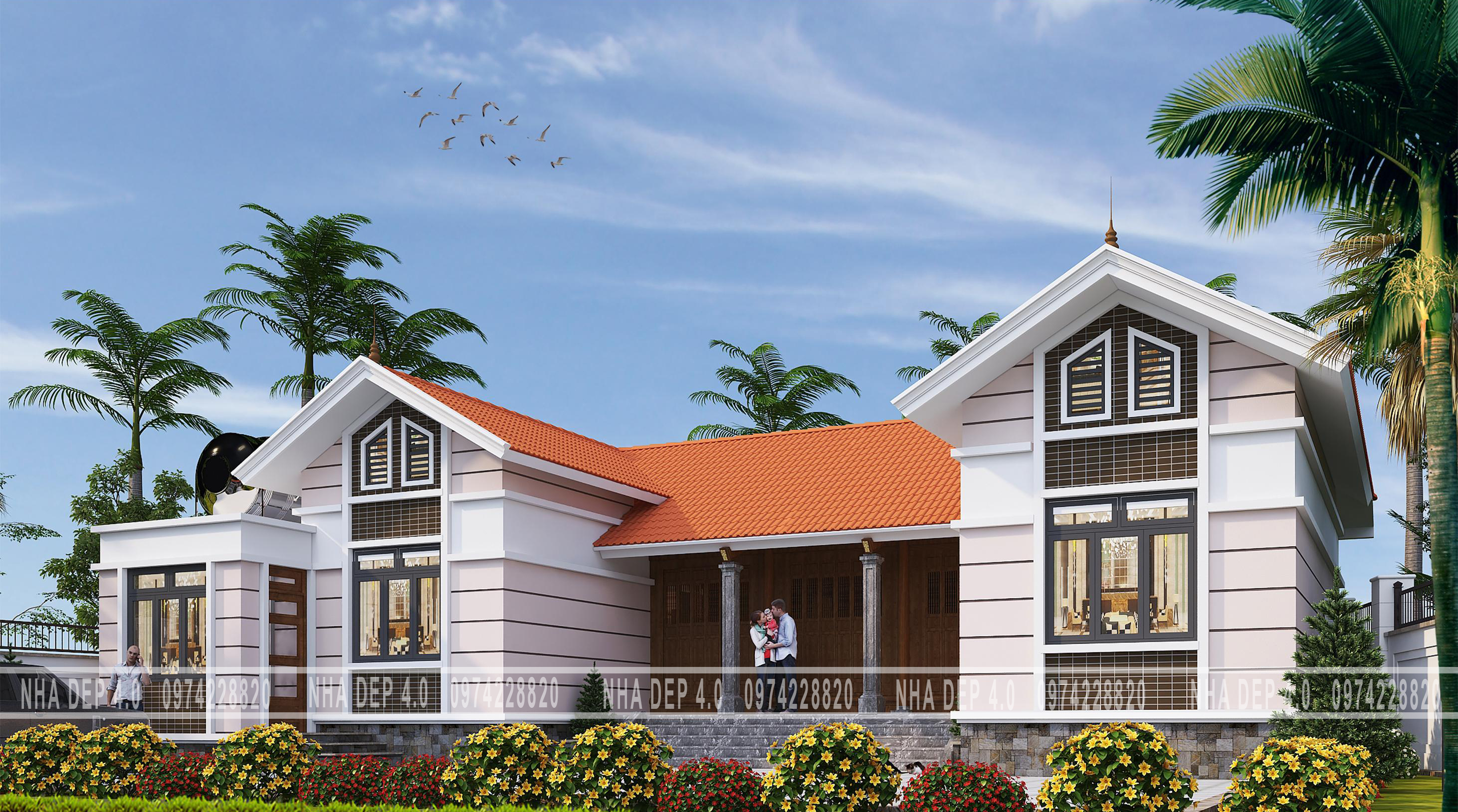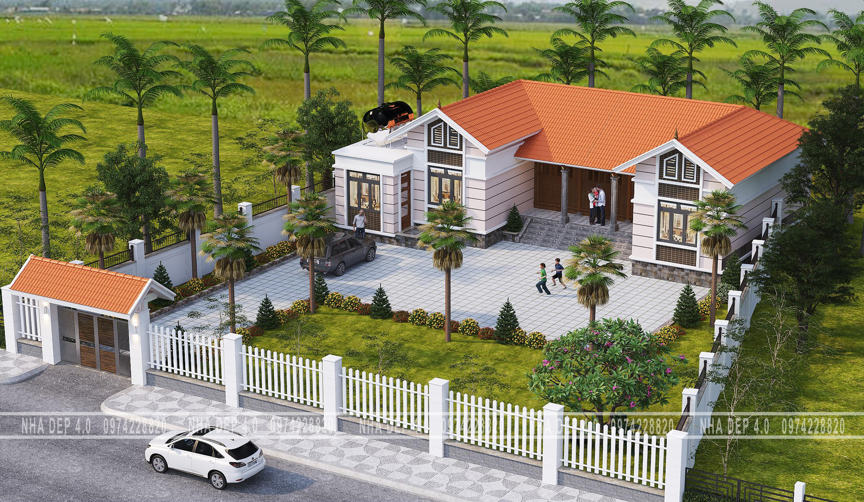 Với thiết kế hệ mái Thái độ dốc cao, cùng hệ ngũ cấp cho công trình sẽ giúp công trình thông thoáng hơn rất nhiều, thiết kế đơn giản nhưng vẫn có sức hút độc đáo, sang trọng. Hệ mái được bố trí 2 mái 2 bên chái, tạo bố cục cân đối cho ngôi nhà.
