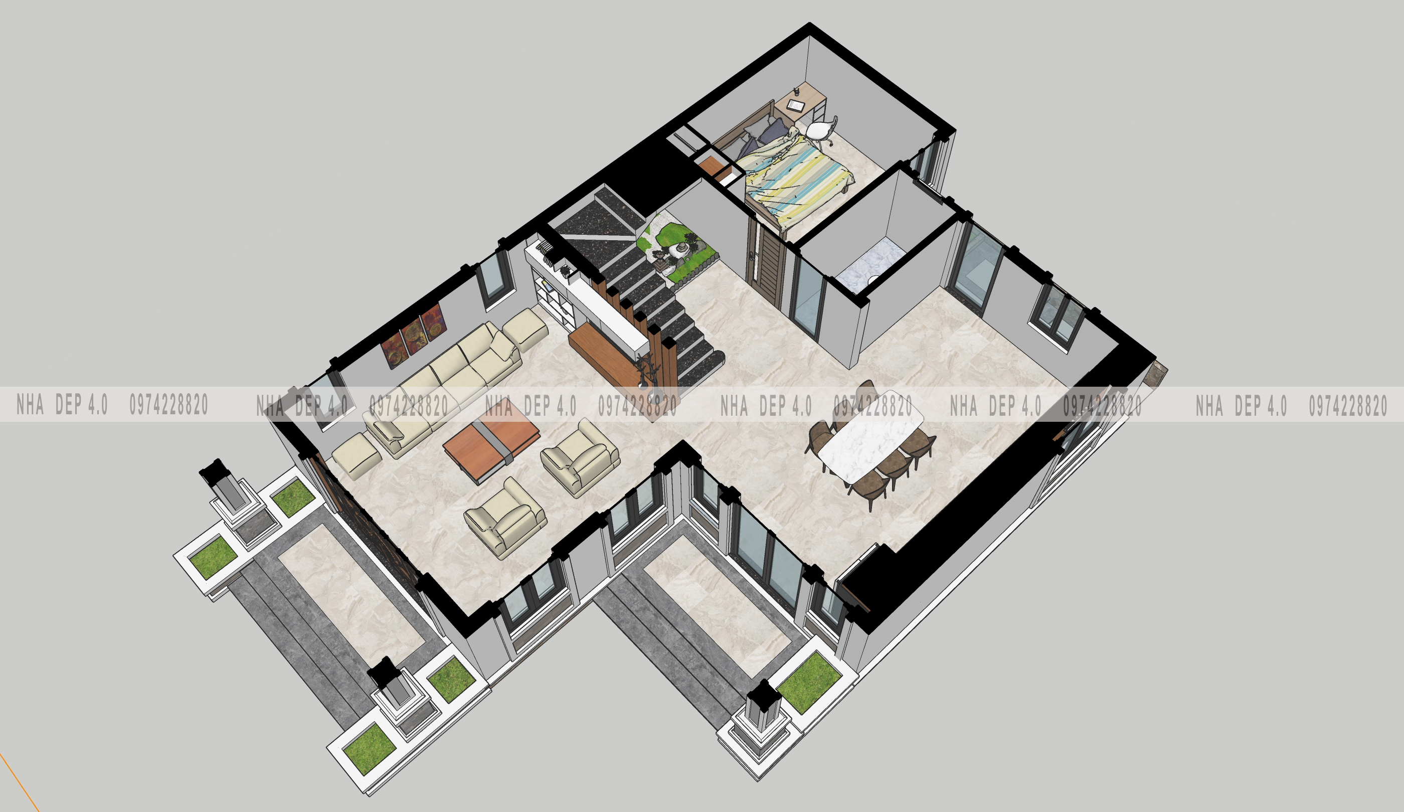 Phối cảnh bố trí công năng + nội thất biệt thự tầng 1