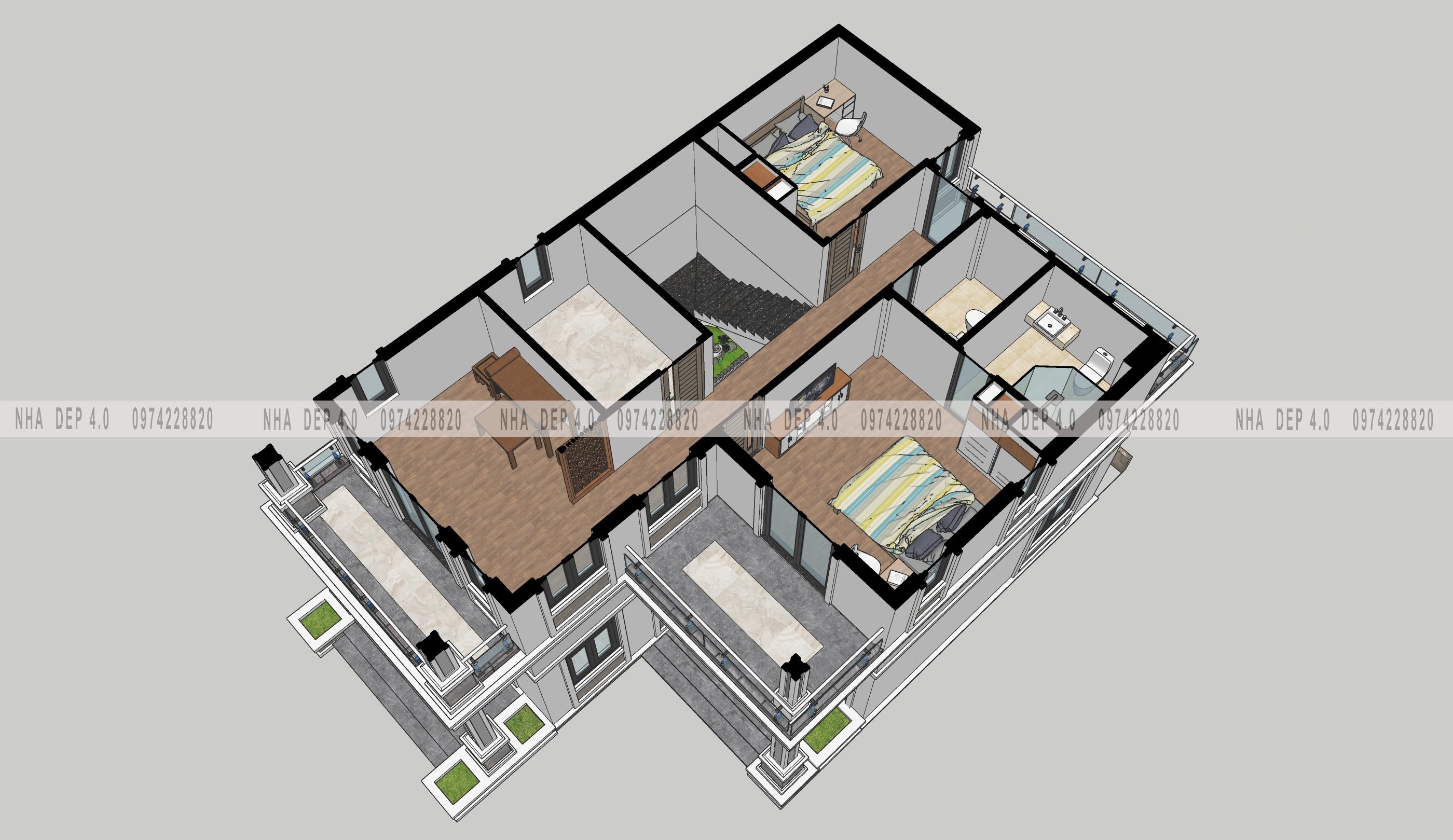 Phối cảnh bố trí công năng + nội thất biệt thự tầng 2