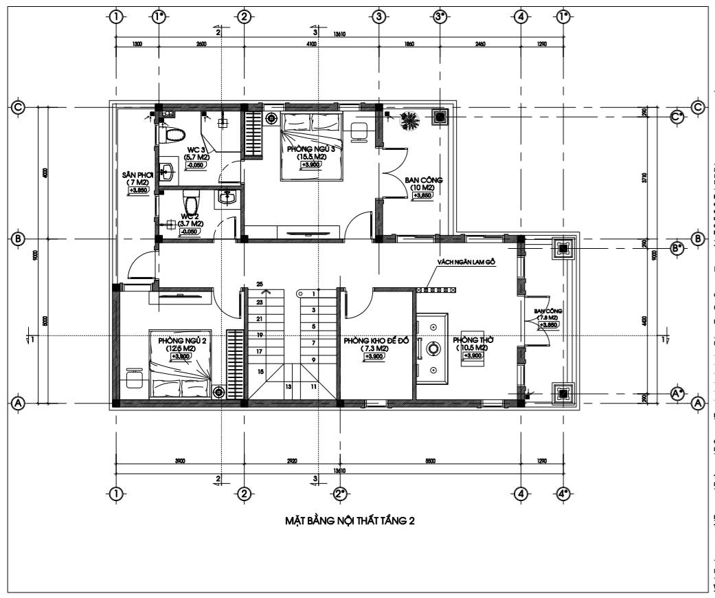 Tầng 2 được phân chia bố cục tương tự. Bước lên tầng 2, phía trước sẽ là 1 phòng ngủ master (15,5m2) với hệ ban công riêng khá rộng. Bên trái là 1 phòng ngủ kích thước tương tự phòng ngủ bên dưới. Phía bên phải sẽ là 1 phòng kho để đồ (~8m2) và một phòng thờ (10,5m2) có ban công riêng.