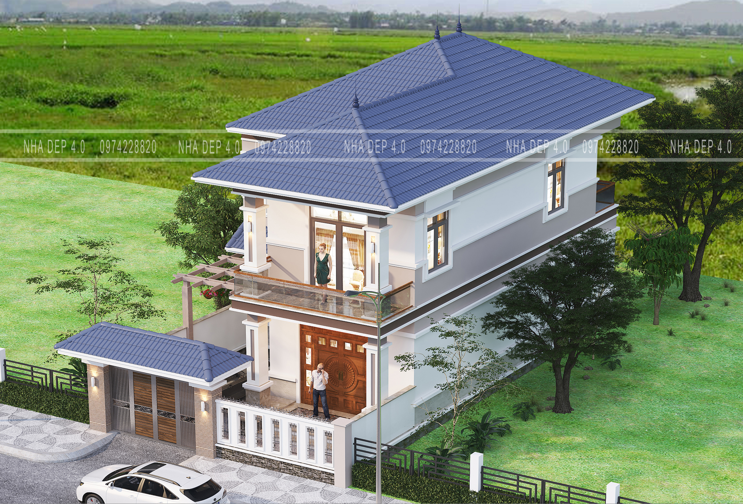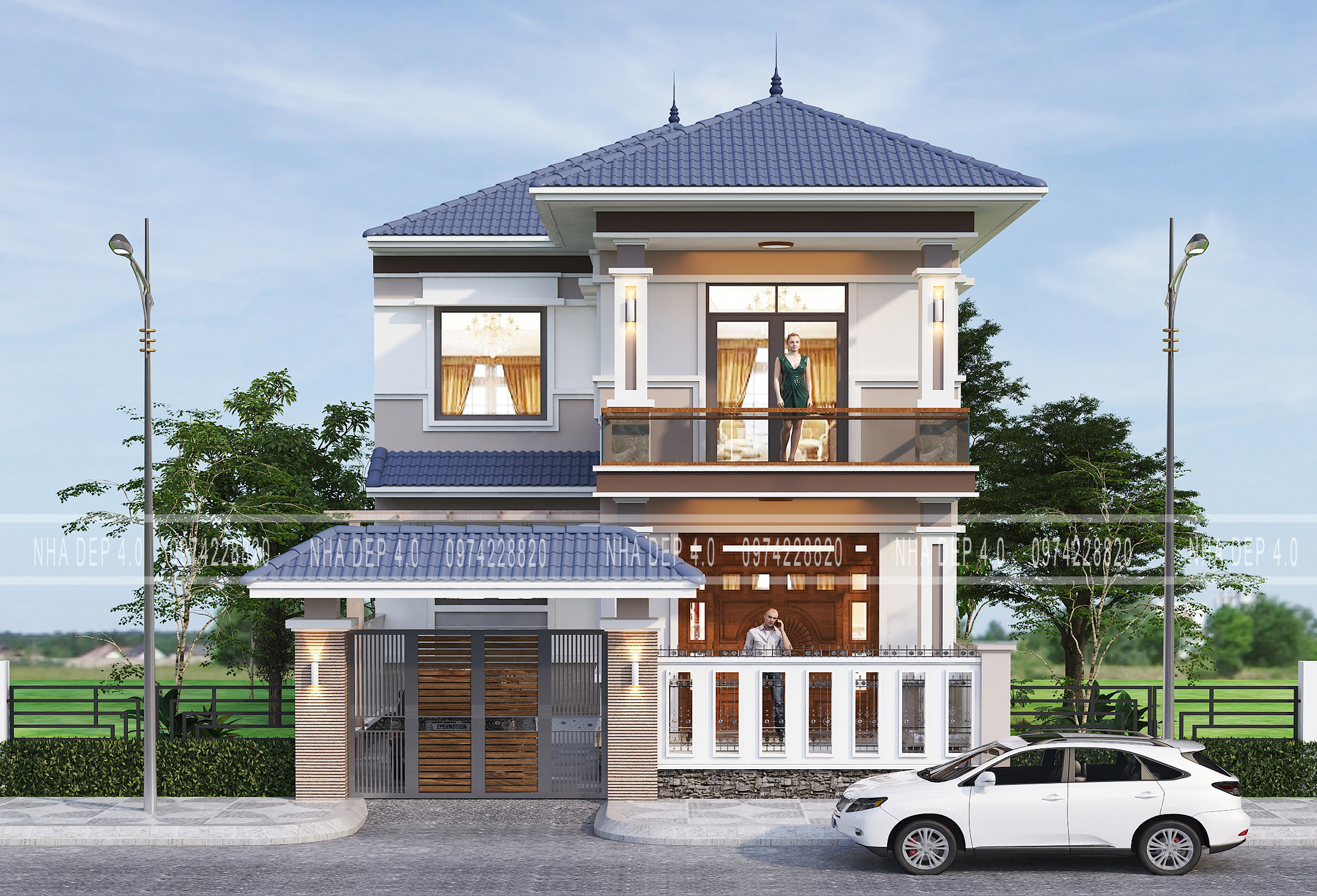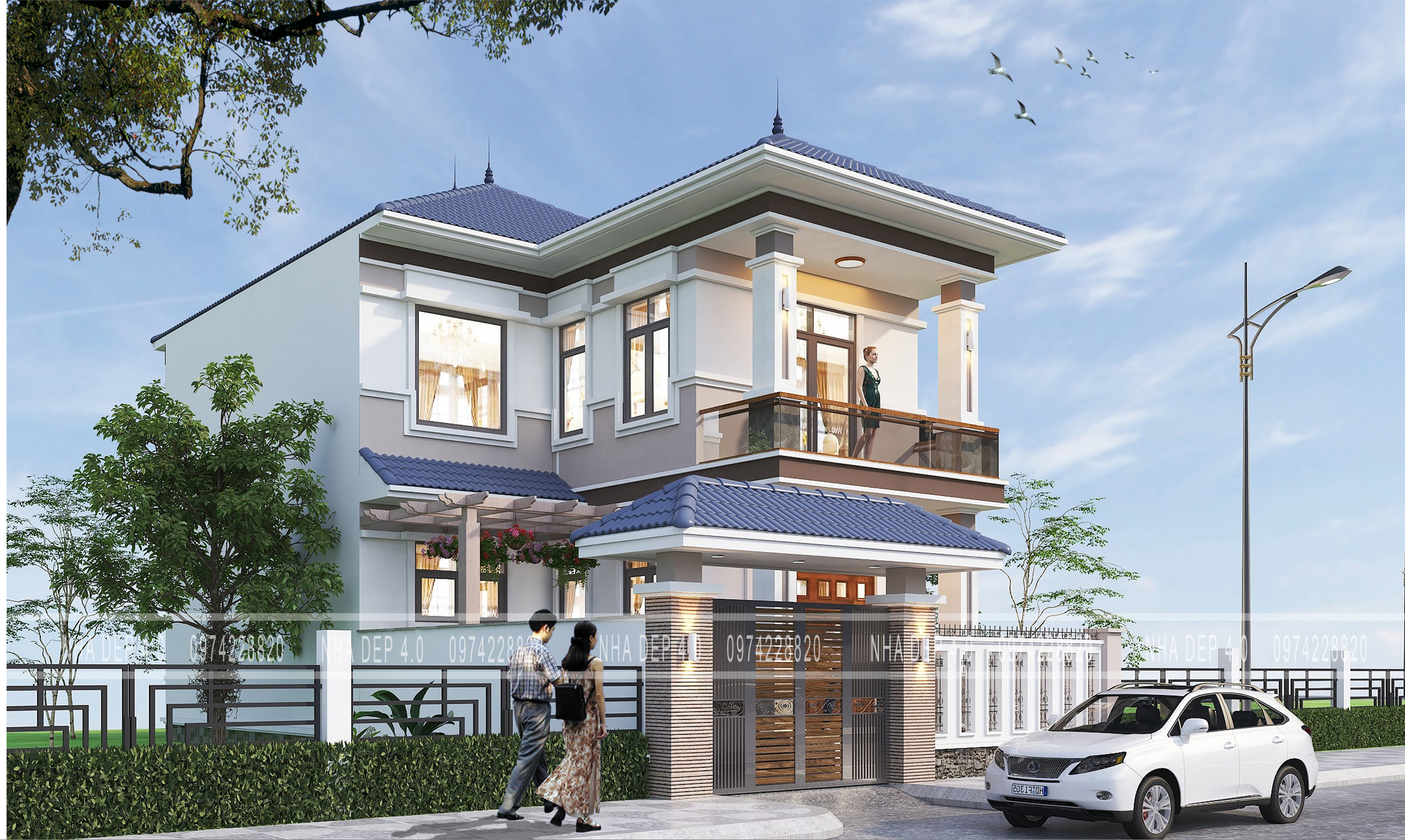Mái ngói màu xanh dương kết hợp cùng tone màu trắng sứ nhẹ nhàng sẽ tạo nên sự liên kết nổi bật và hơi hướng hiện đại. Ngoài ra, ngôi nhà còn được sử dụng màu cà phê sữa tạo điểm nhấn trên các phần phân tầng, kẻ chỉ trên thân cột và hệ lam gỗ trước sảnh phụ. Thân nhà và viền cửa sổ còn được bật lên bởi những gờ đắp nổi chạy xung quanh tạo điểm nhấn mạnh cho công trình của nhà anh Tuấn. Hệ lan can kính được bố trí trên tầng 2 giúp công trình trở nên hiện đại và sang trọng hơn.