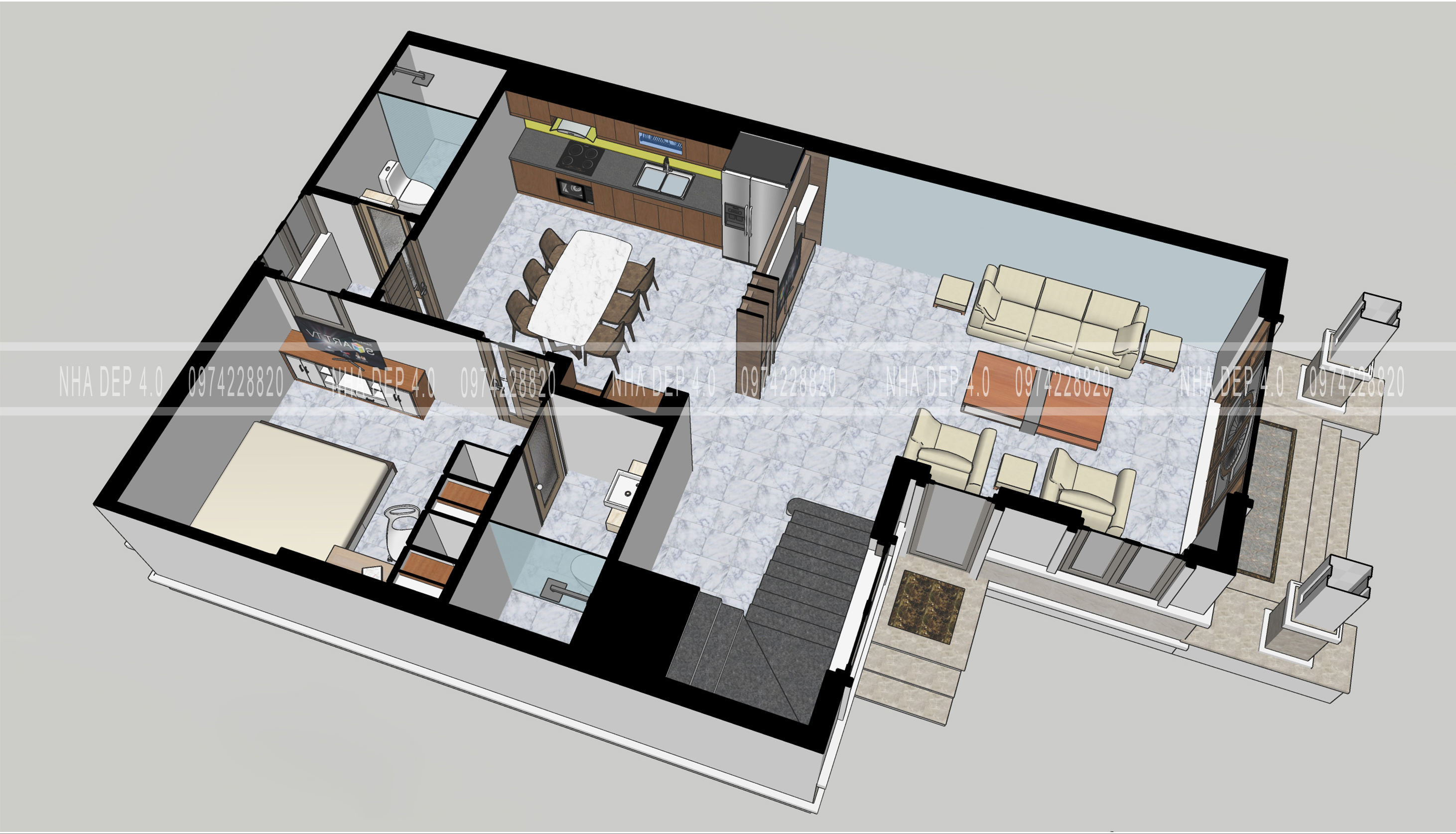 Phối cảnh bố trí công năng + nội thất biệt thự tầng 1