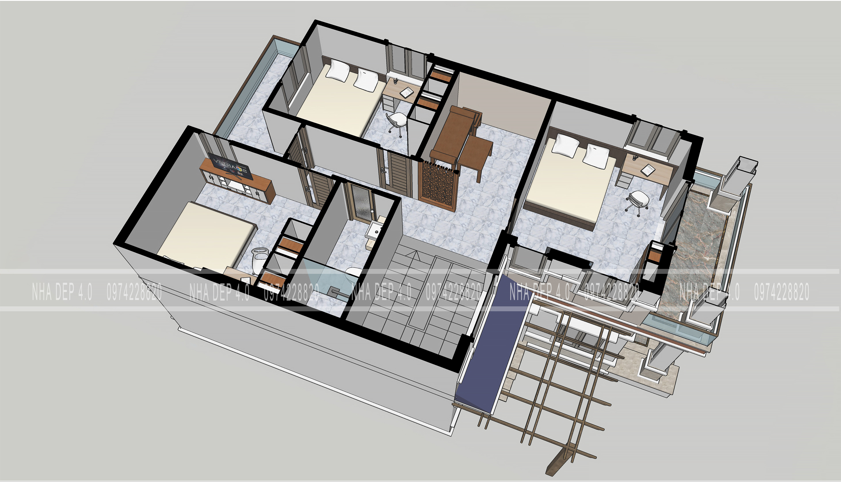 Phối cảnh bố trí công năng + nội thất biệt thự tầng 2