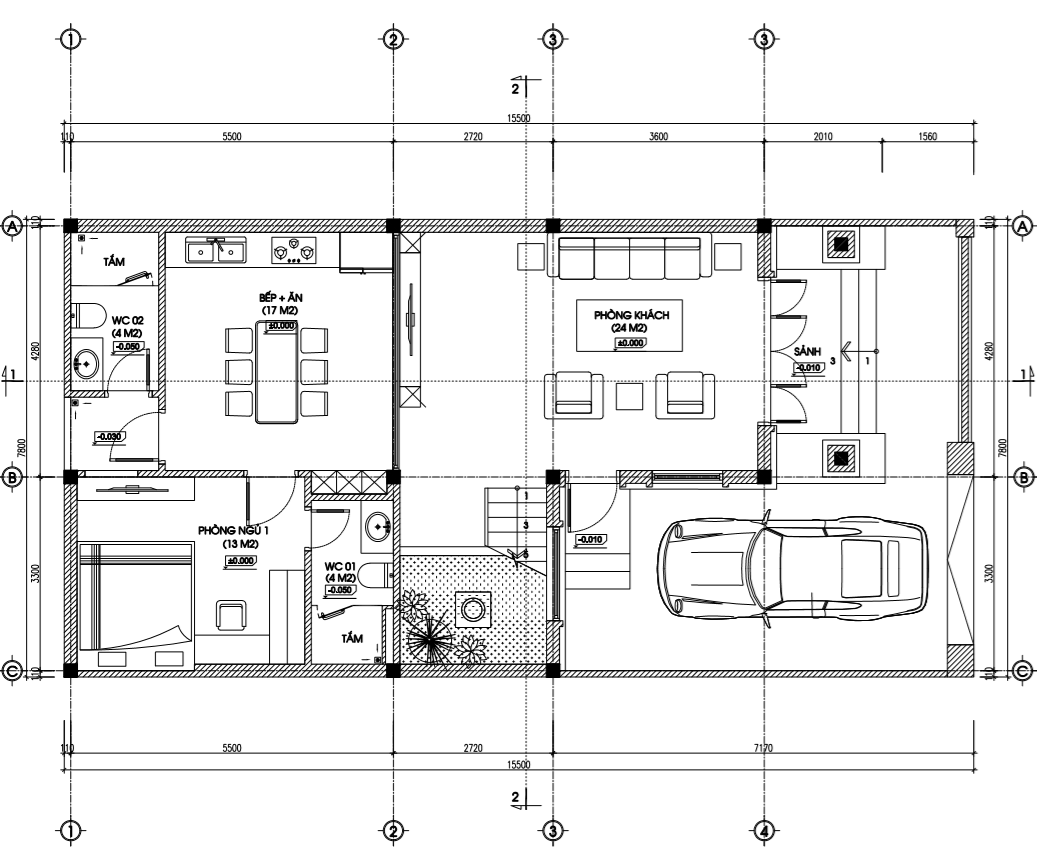 Tiếp đó là không gian phòng bếp (17m2) và 1 phòng ngủ (13m2) có wc riêng. Wc chung của tầng 1 đặt sau khu vực bếp (4m2).