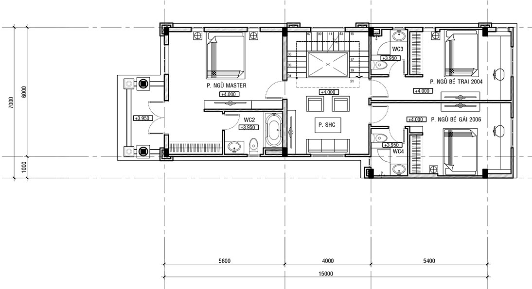 Tầng 2 được dành trọn vẹn cho gia đình Mr. Anh. Phòng ngủ master được thiết kế hướng ban công trước, có thể đón nhận được nhiều ánh sáng và gió thoáng không khí, thiết kế khép kín nên rất thuận tiện cho việc sinh hoạt. Đối diện với sảnh thanh thông tầng trung tâm là phòng sinh hoạt chung của các thành viên. Đối diện với phòng ngủ của bố mẹ và tạo thành lối giao với phòng sinh hoạt chung, hai phòng ngủ dành cho hai con được thiết kế tiếp giáp với nhau, thiết kế có nhà vệ sinh riêng nên rất thuận tiện cho việc sinh hoạt của các con.