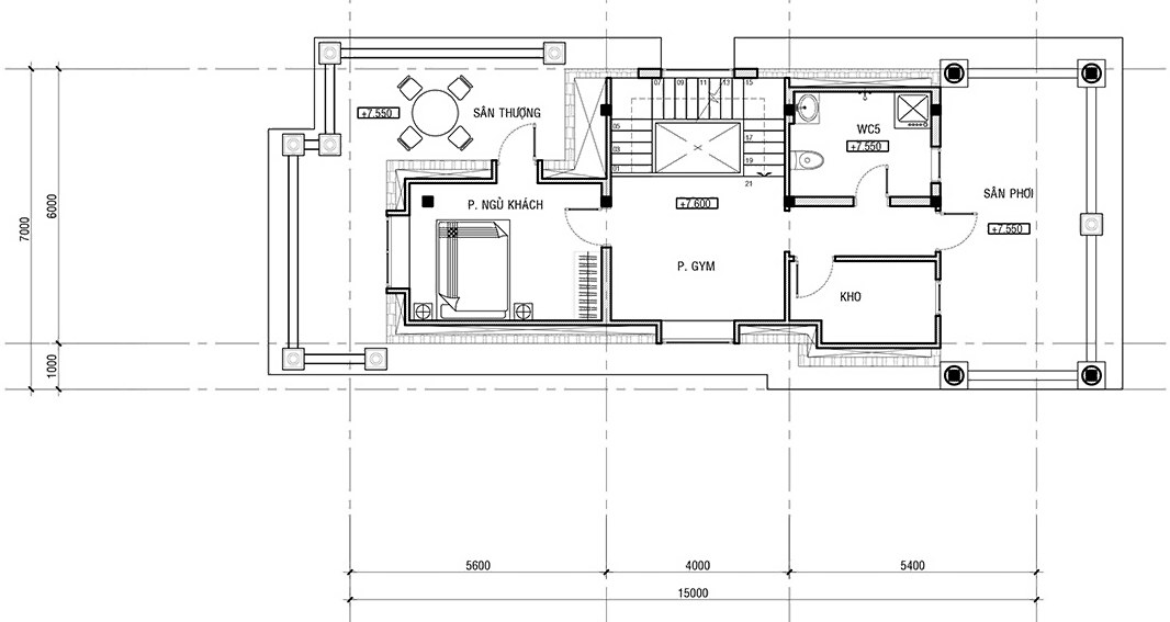 Tầng 3 mẫu biệt thự 3 tầng tân cổ điển thiết kế 1 phòng ngủ cho khách ở lại qua đêm, gần với sân thượng với view nhìn khá đẹp mắt. Đối diện sảnh thang là phòng tập gym, phía trong là nhà vệ sinh, kho, kết nối trực tiếp với sân phơi của tầng.