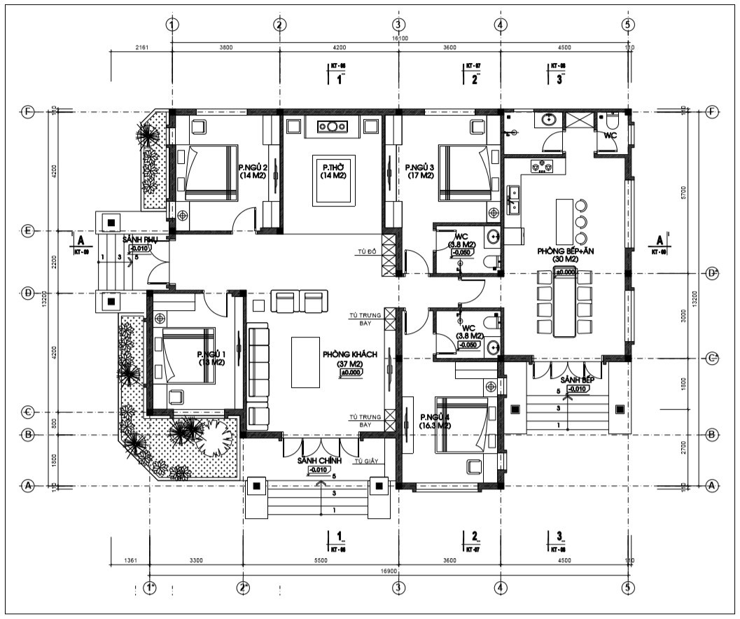 - Công năng dự kiến thi công là 4 phòng ngủ, 1 phòng thờ, 1 phòng khách, phòng bếp và wc chung thiết kế thông thoáng và có sự tách biệt với cách không gian khác.
