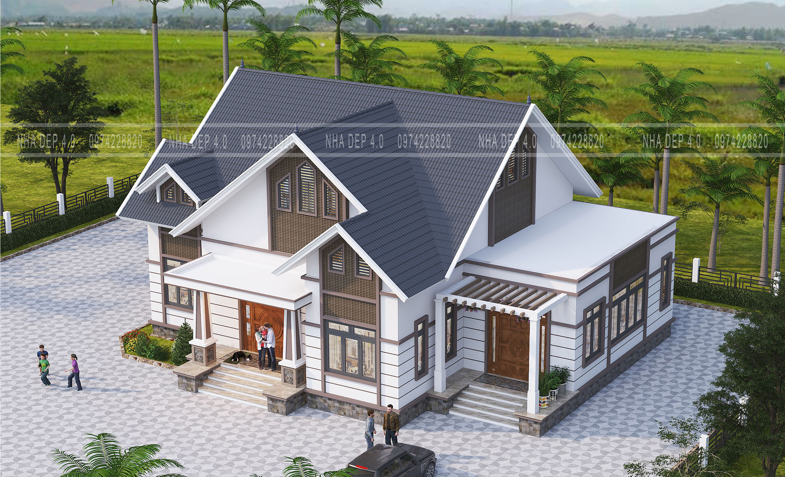 Với thiết kế hệ mái Thái độ dốc cao, cùng 2 sảnh chính cho công trình sẽ giúp công trình thông thoáng hơn rất nhiều, thiết kế đơn giản nhưng vẫn có sức hút độc đáo, sang trọng. Hệ mái được bố trí 2 mái chính và 1 mái phụ, vừa tạo bố cục hài hòa cân đối, vừa mang điểm nhấn độc đáo cho ngôi nhà.