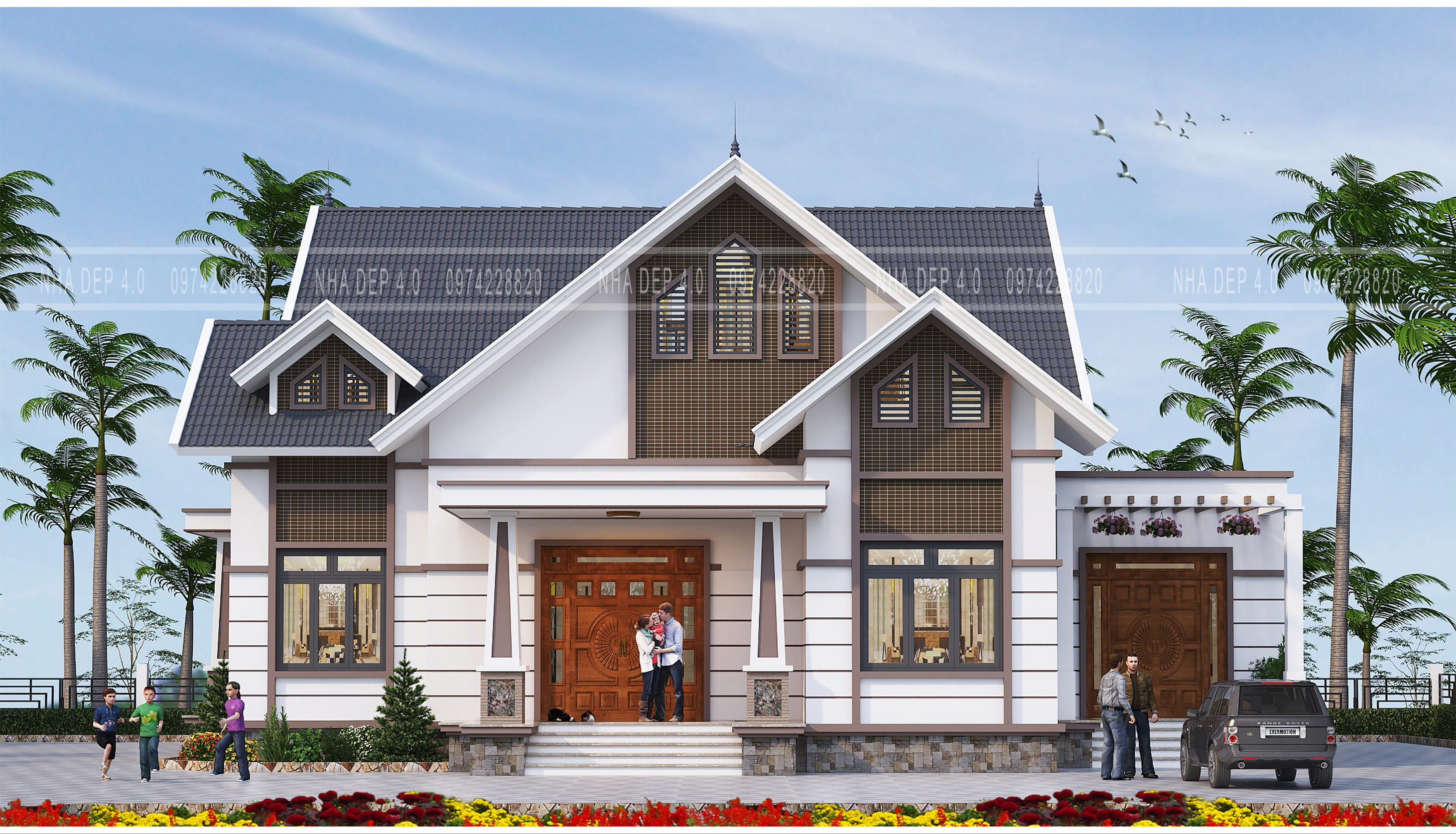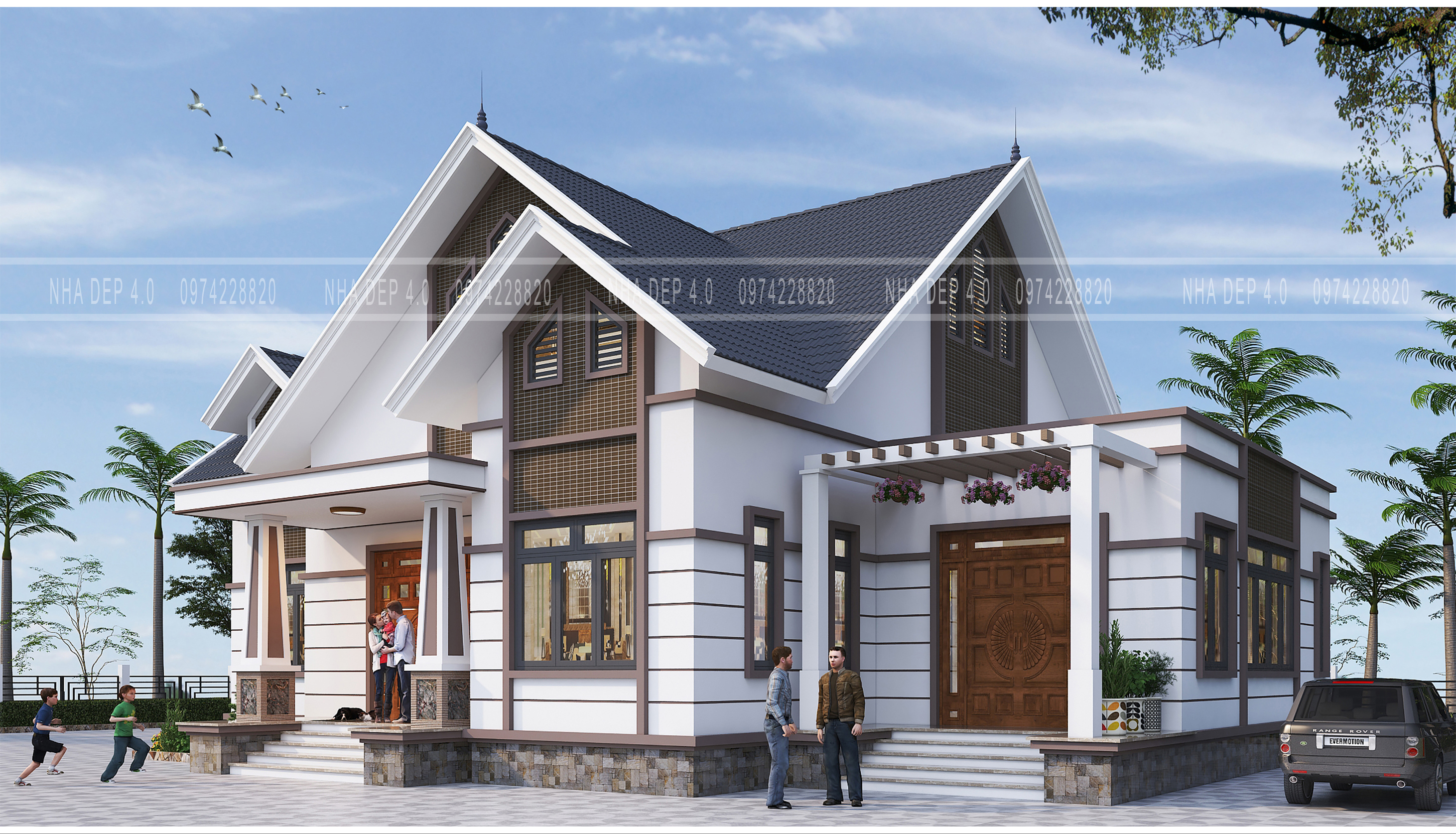 Mái ngói màu ghi kết hợp cùng tone màu trắng sứ sẽ tạo nên sự nổi bật và hơi hướng hiện đại. Ngoài màu trắng sứ, thân nhà còn được bật lên bởi màu của cửa sổ hệ nhôm xingfa, màu café đậm trên các viền cửa sổ, đường kẻ chỉ, trên 2 cột chính của ngôi nhà. Đồng thời trên các hệ cửa sổ và cửa sổ giả cũng được ốp gạch thẻ cùng màu café đậm tạo điểm nhấn nổi bật. Việc kết hợp màu sắc này giúp công trình của chúng ta không chỉ mạnh mẽ, bề thế, mà còn rất cuốn hút và nổi bật.