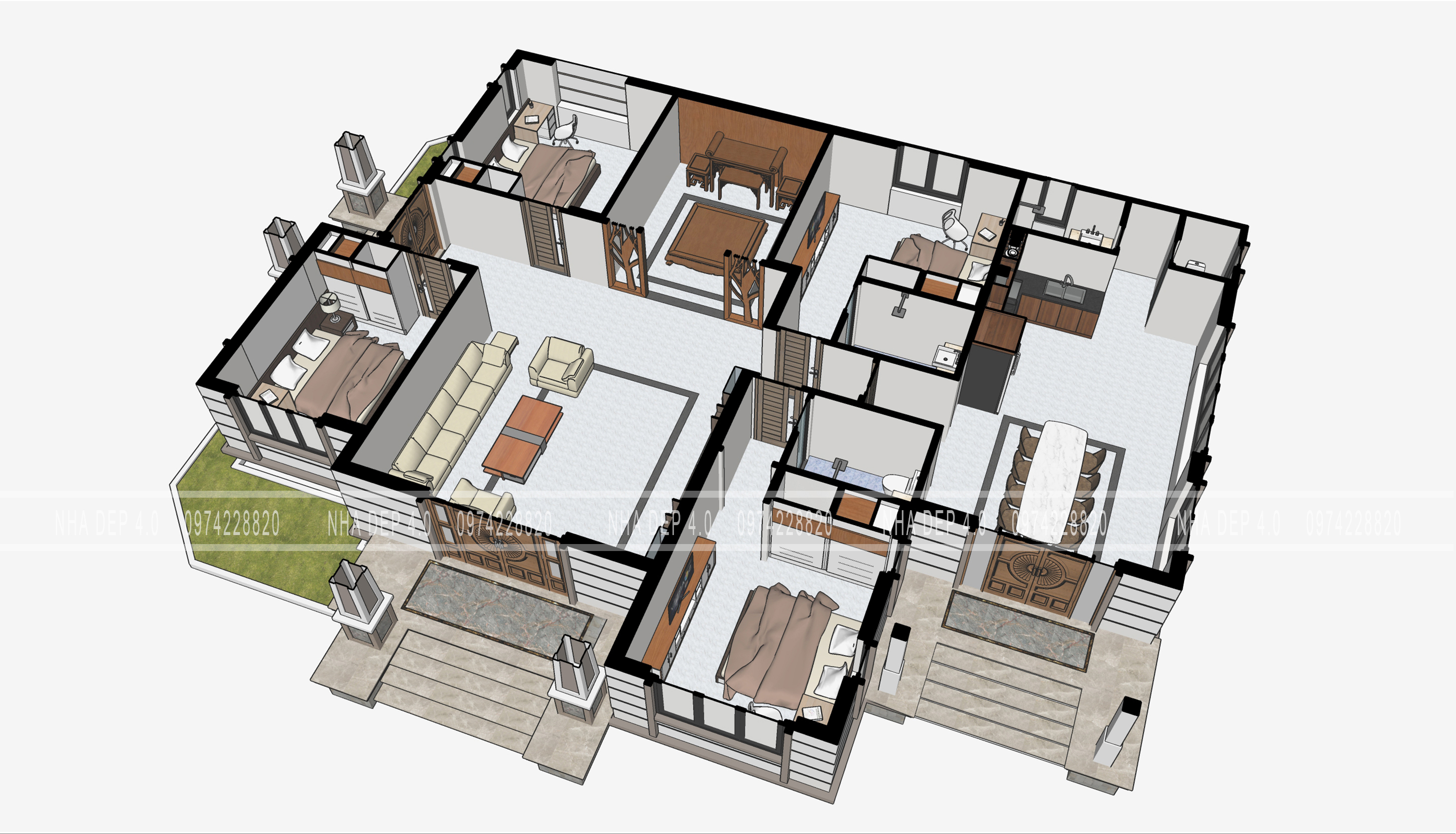 Phối cảnh bố trí công năng + nội thất nhà cấp 4 mái Thái diện tích 13x16m