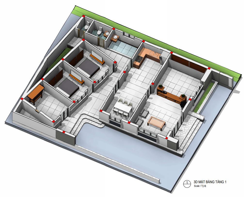 - Công năng dự kiến thi công là 2 phòng ngủ, 1 phòng thờ, 1 phòng khách.