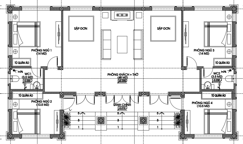 - Công năng: 4 phòng ngủ, 1 phòng thờ, 1 phòng khách (khu phụ đặt bên ngoài).