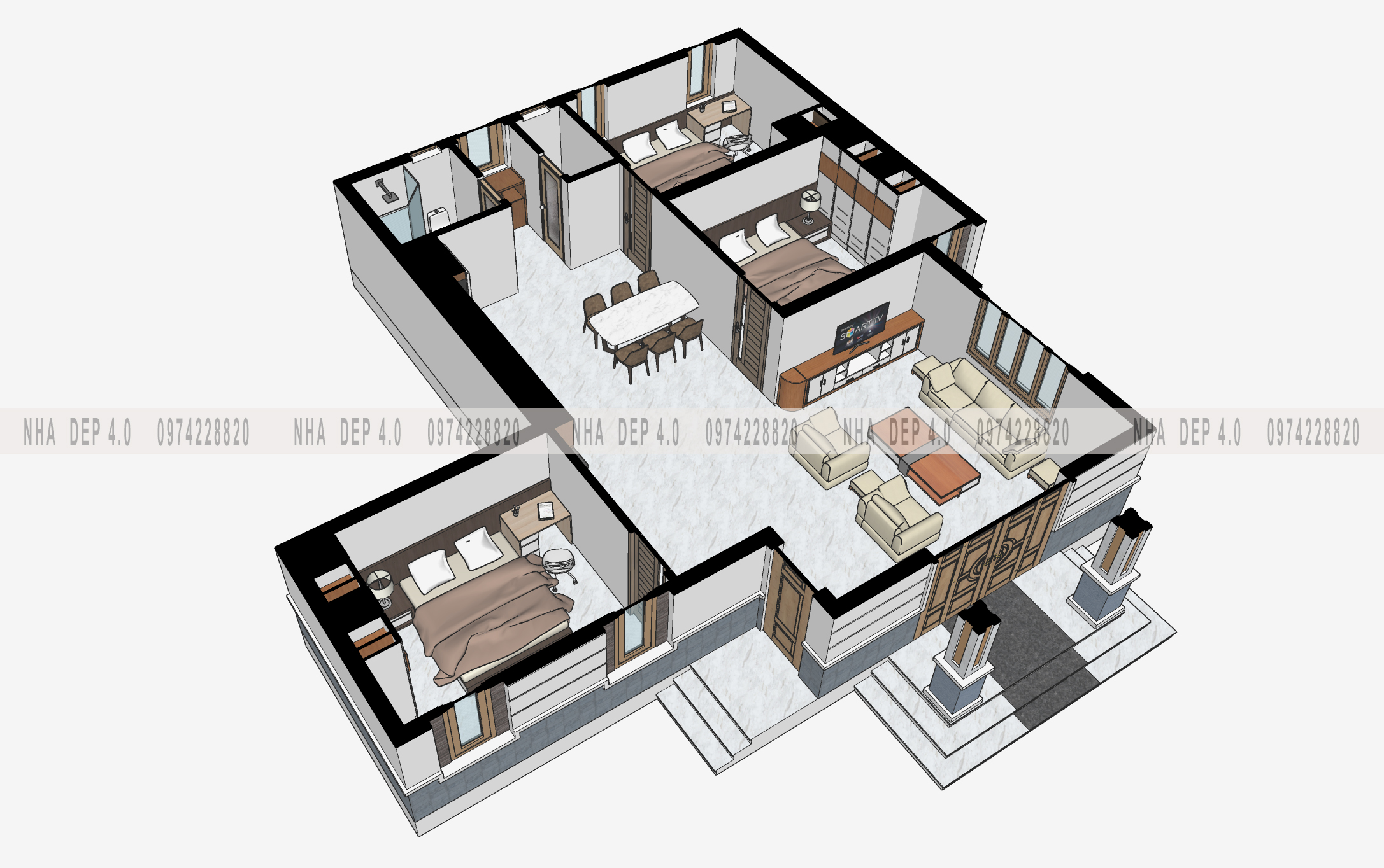 Phối cảnh công năng mẫu biệt thự 1 tầng 3 phòng ngủ