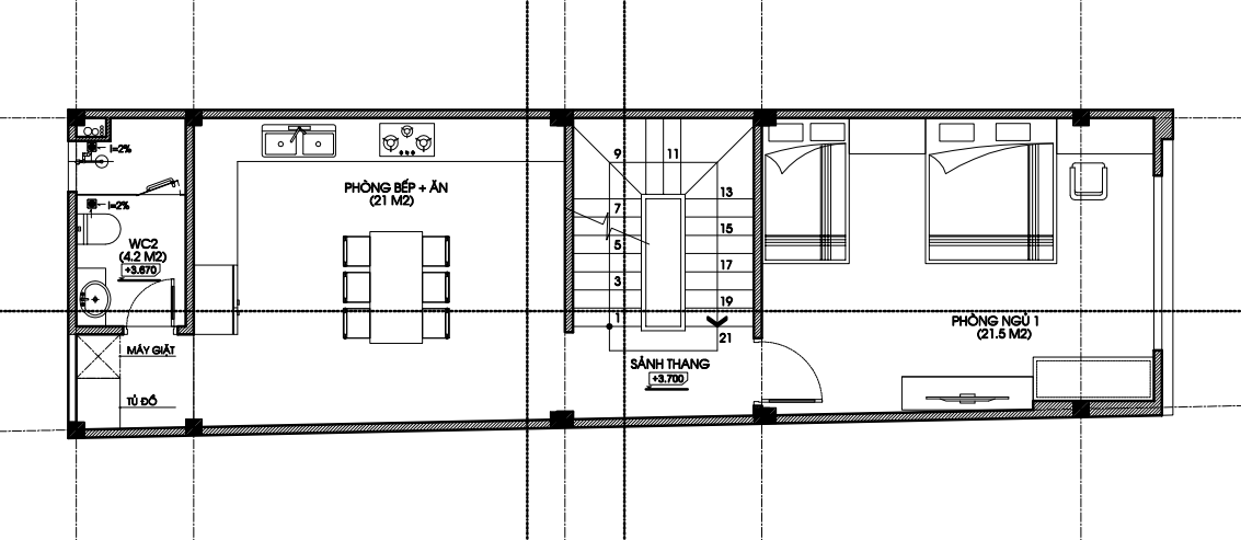Công trình được xây dựng với kích thước mặt tiền 4,2m, chiều sâu 14m. Bước từ sảnh chính đi vào là phòng khách rộng 17m2. Nơi tiếp đón khách được đặt bộ bàn ghế sofa gọn gàng. Hệ thống cầu thang ngăn cách phòng khách với các khu vực bên trong. Bên trong là 1 không gian tự do. Có thể là một nơi làm việc lưu động, nơi vui chơi của cả nhà, hoặc đơn giản là nơi cần sử dụng đến rất nhiều khi nhà có công việc. Còn lại khu vực sau cùng là vệ sinh chung rộng 3m2. Lên tầng 2, phía bên trái cầu thang là 1 phòng ngủ rộng 21,5m2. Bên phải cầu thang là khu vực bếp ăn rộng 21m2 cùng 1 khu phụ để máy giặt và tủ đồ. Vệ sinh chung được đặt vị trí tương tự như dưới tầng 1. Tầng 3 còn lại công năng bao gồm 1 phòng thờ rộng 17m2 và 1 phòng ngủ master rộng 21,5m2.