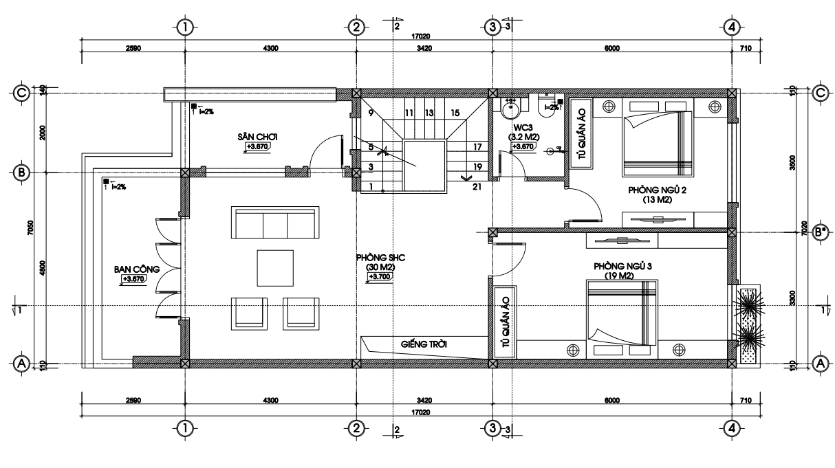 Lên trên tầng 2 là những không gian riêng tư của 2 phòng ngủ bên phải cầu thang. Một phòng ngủ nhỏ có kích thước 13m2, và một phòng ngủ lớn rộng 19m2. Cùng 1 vệ sinh chung toàn tầng 2 rộng 3,2m2 . Bên phải cầu thang là 1 phòng sinh hoạt chung 30m2. Trên tầng 2 có 1 sân chơi và 1 ban công rộng rãi, giúp mọi người có vị trí thư giãn mỗi lúc căng thẳng.