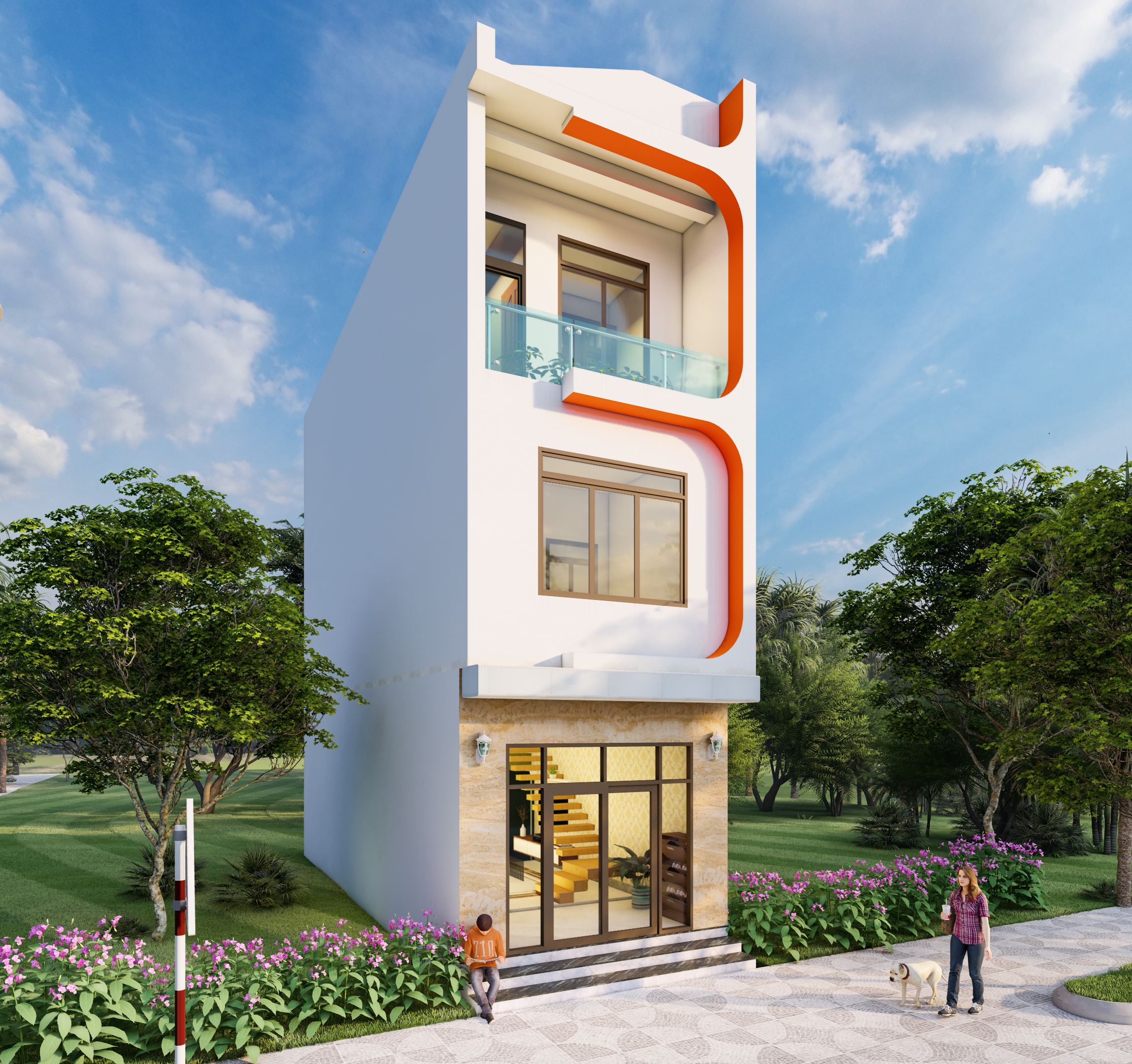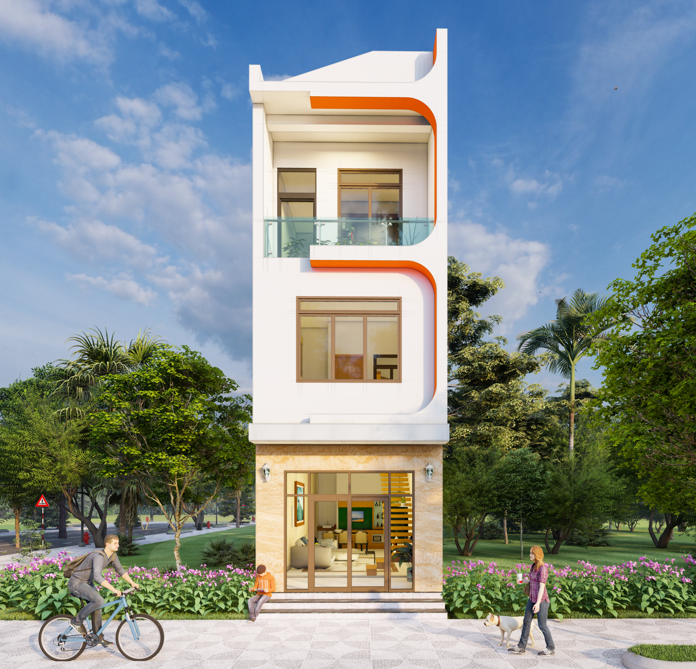 Ngôi nhà ống hiện lên với những bố cục hình khối đơn giản, giật cấp nhẹ nhàng. Gam màu trắng được mix cùng với màu cam nổi bật. Cùng với những phần đá ốp vân mây tông màu sáng được ốp ở mặt tiền tầng 1. Tất cả những chi tiết phối trí mix cùng nhau vô cùng hòa hợp, tạo nên điểm nhấn ấn tượng mà không bị khoa trương chút nào. Có thể nhận thấy rõ các KTS đã rất tỉ mỉ và chú trọng khi thiết kế mặt tiền cho ngôi nhà. Đây được xem là nhược điểm của mẫu nhà ống nhưng cũng là một cơ hội để KTS thể hiện được tài năng của mình. Lược bỏ những chi tiết rườm rà là phương án tối ưu nhất để bề mặt tiền lấy được sự thông thoáng hoàn hảo.