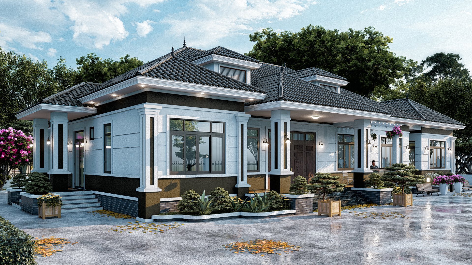 Từ cos sân được bố trí với bậc tam cấp cao ráo liên thông nên tới cos nền, để đảm bảo mức độ an toàn trong việc đi lại cũng như là góp phần vào yếu tố thẩm mỹ phần bậc thềm được ốp đá granite sang trọng. Không chỉ vậy, hai bên dãy bậc còn được thiết kế với hai trụ lớn tận dụng đặt các chậu cây lớn đóng vai trò tạo hiệu ứng xanh cho ngôi nhà.